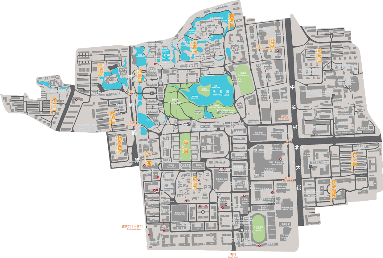 北京大學校本部坐落在燕園,包括淑春園、勺園、朗潤園、鏡春園、鳴鶴園、蔚秀園、暢春園、承澤園等, 每逢節日,博雅塔會亮起絢爛的燈光,在明清兩代是著名的皇家園林,數百年來,其基本格局與神韻依然存在。校園北與圓明園毗鄰、西與頤和園相望。北京大學充分利用了這一難得的歷史遺產,營建了風景如畫的校園環境,使之既有皇家園林的宏偉氣度,又有江南山水的秀麗特色。這里不僅有亭臺樓閣等古典建筑,而且山環水抱,湖泊相連,堤島穿插,風景宜人。校園內古木參天,綠樹成蔭,四季常青,鳥語花香,園林景色步移景異。優美典雅的環境內充滿著豐富多彩、魅力無窮的校園生活,使學生可以同時感受到自然的風景和濃厚的人文氣息。未名湖與博雅塔是北京大學的標志性景觀,美麗的湖光塔影伴隨著大師的背影,構成燕園中最美的圖畫。著名的“一塔湖圖”指的就是未名湖湖畔的景色。
